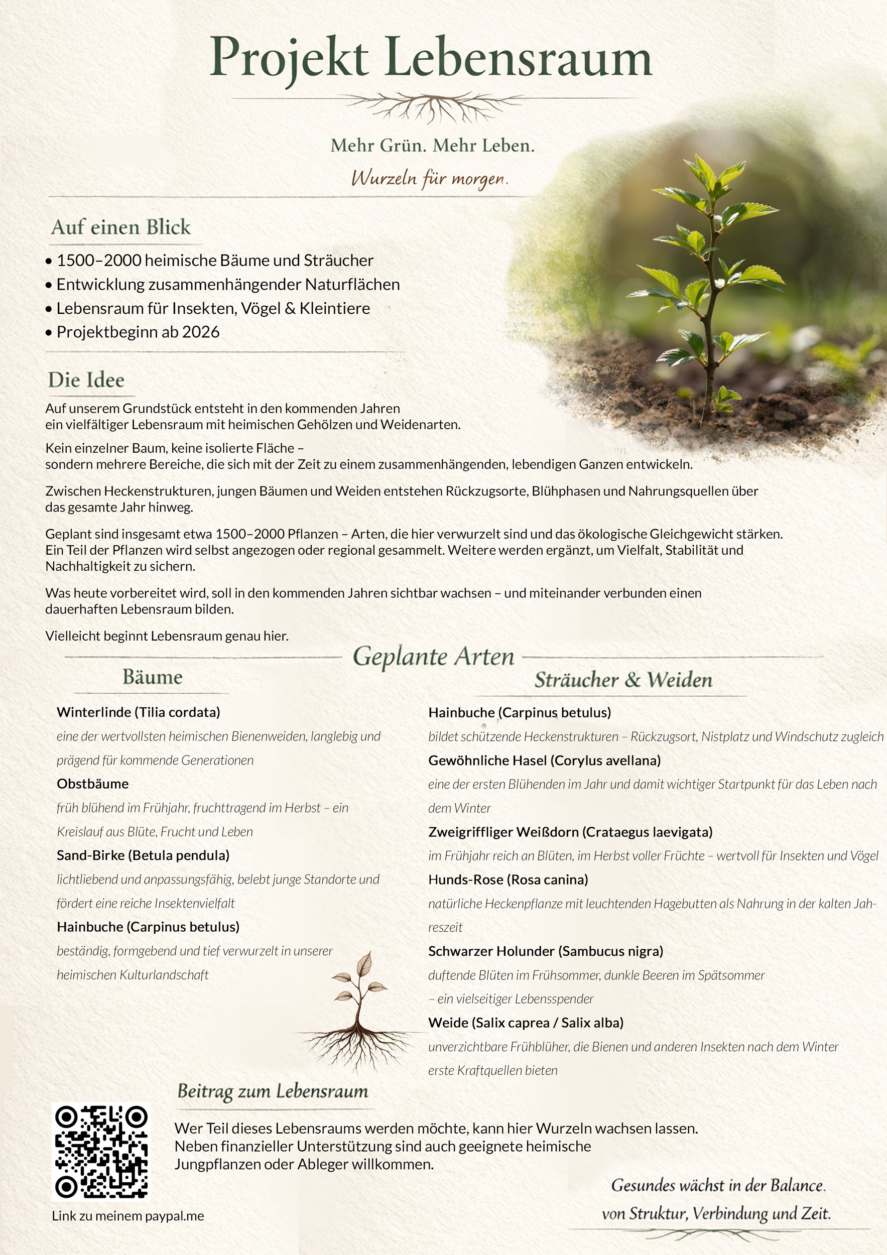 Auf unserem Grundstück beginnt in den kommenden Jahren die Entwicklung eines vielfältigen, zusammenhängenden Lebensraums mit heimischen Gehölzen, Sträuchern und Weidenarten. Was zunächst wie einzelne Pflanzflächen erscheint, soll sich mit der Zeit zu einem gewachsenen Ganzen verbinden.